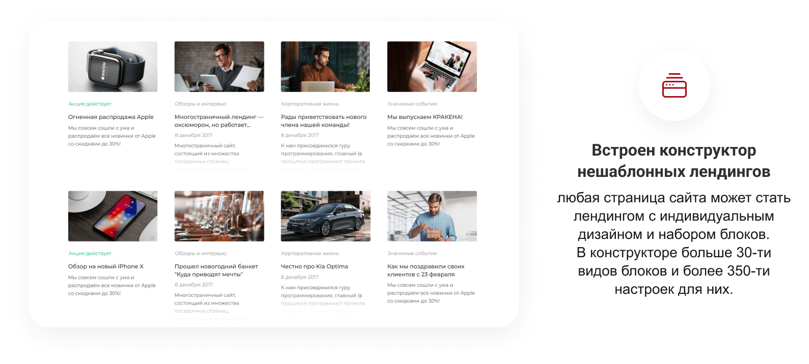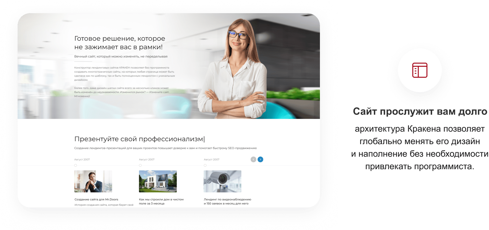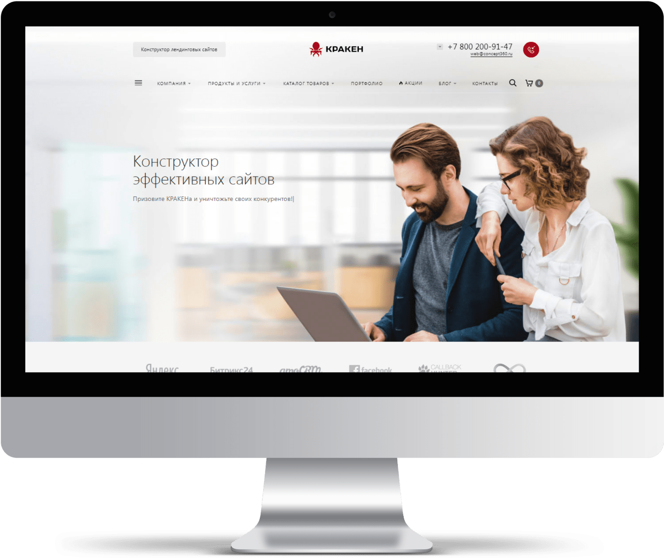 КРАКЕН — уникальное для маркетплейса решение. Вы сможете создать многостраничный сайт, каждая страница которого — это полноценный лендинг. При этом сайт можно сделать без знаний в программировании, а его SEO-оптимизацию провести без привлечения специалиста.
