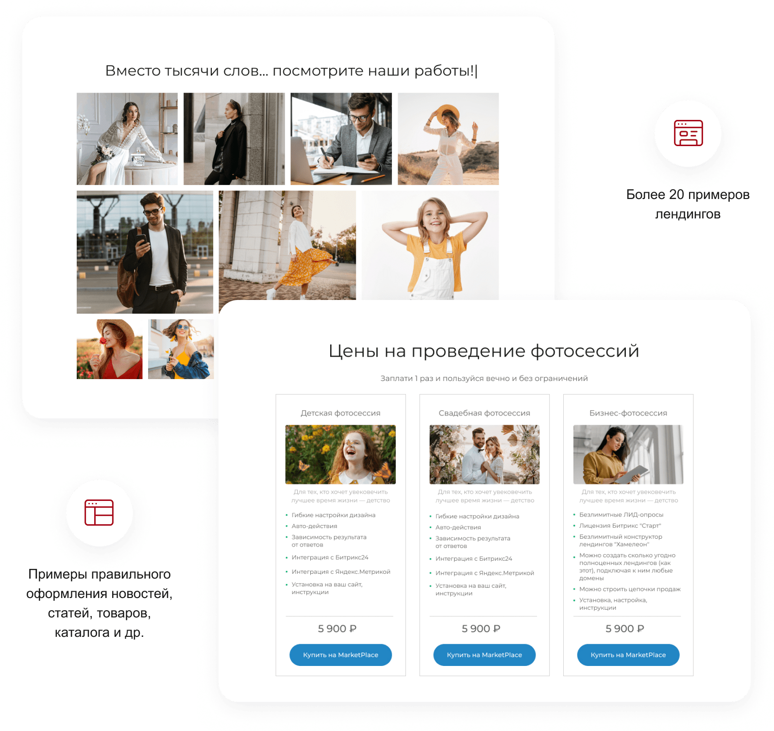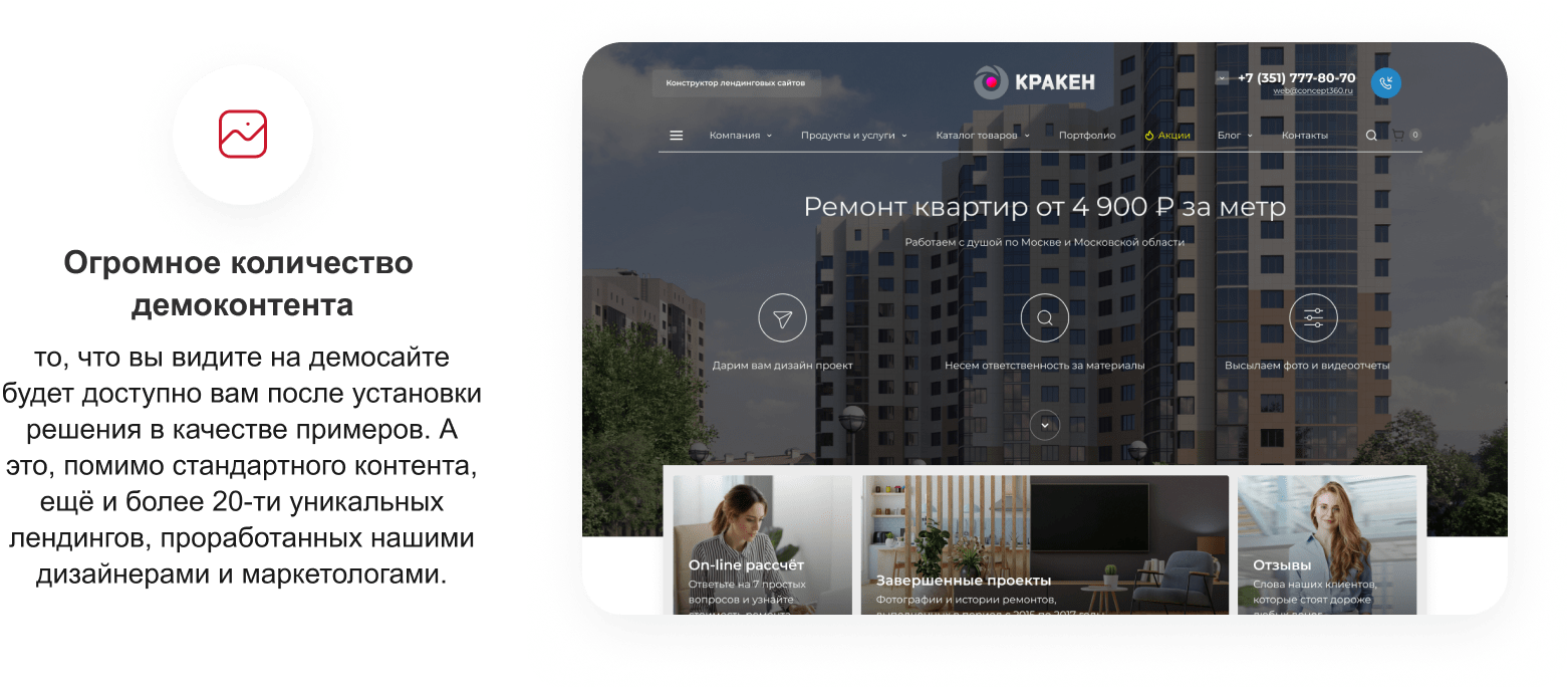 Та информация, которую вы видите на демосайте будет доступна вам после покупки и установки решения. Его проработали наши дизайнеры и маркетологи в течение 2-х месяцев. И теперь вы всё это сможете использовать как основу для вашего сайта. А это более 20-ти разнообразных лендингов (смотрите их дальше), а также примеры оформления шаблонных разделов! Ни в одном другом готовом решении нет такого разнообразия демоконтента.