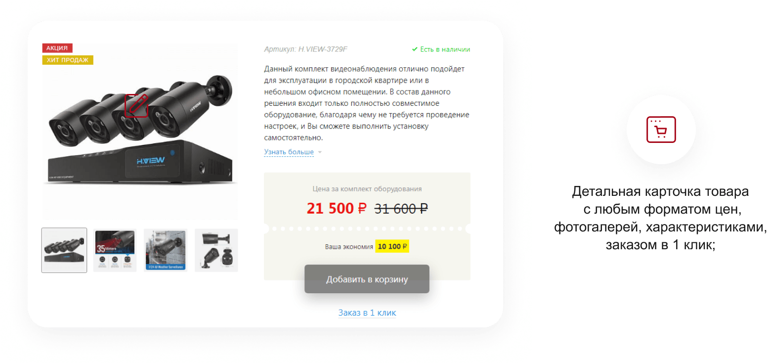 Товарные карточки максимально подробно продуманы и позволяют даже с помощью встроенного шаблона делать разный набор и порядок блоков.Но, разумеется, при необходимости вы можете сделать страницу товара и в виде уникального лендинга.