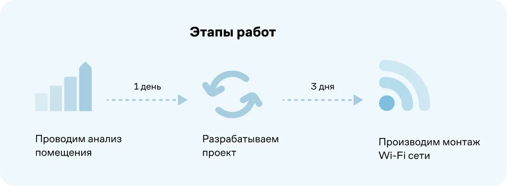 Наша команда специалистов проведет аудит вашего офиса, предложит решения для оптимизации, установит необходимое оборудование и обеспечит поддержку на всех этапах. Мы знаем, как обеспечить качественный Wi-Fi в офисе.